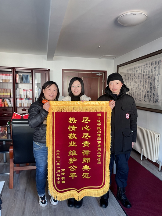 2022年1月20日上午,当事人高先生及爱人来到辽宁民同律师事务所找到王健律师,送上了锦旗,锦旗上烫着金色的“尽心尽责 律师典范 热情敬业 维护公平”,以表由衷的感谢。