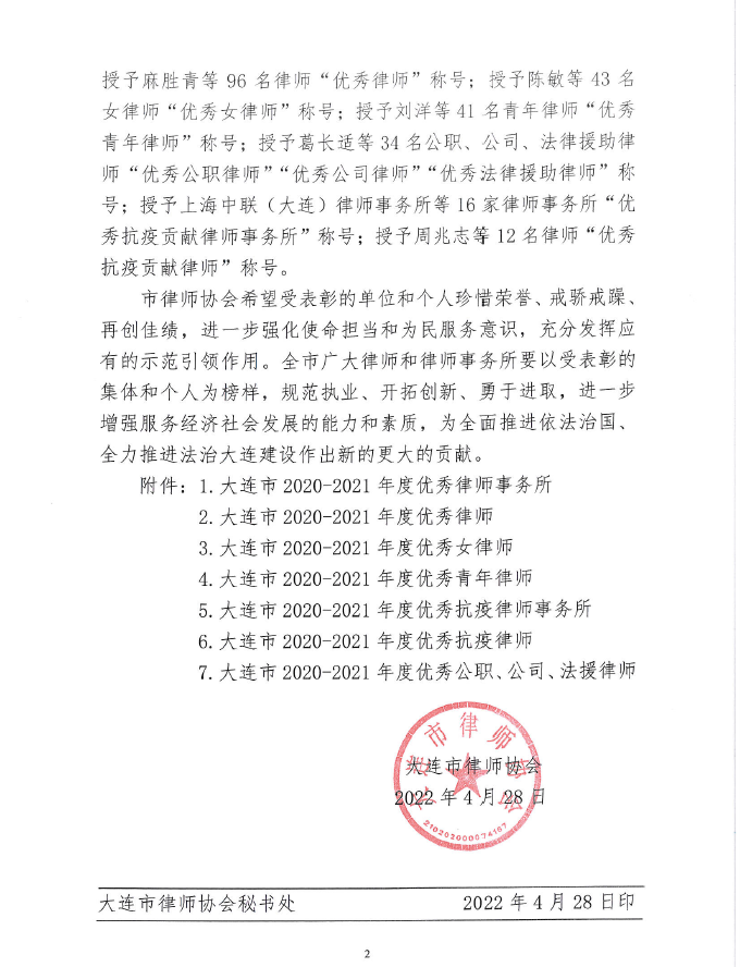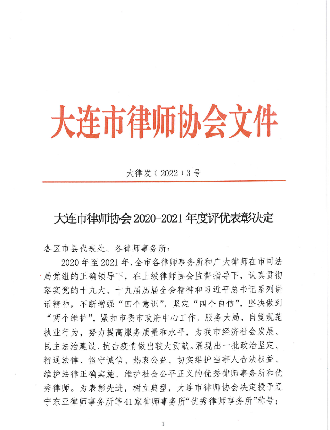 2022年4月28日,大连市律师协会发布大律发【2022】3号文件,对在2020年-2021年度政治坚定、精通法律、恪守诚信、热衷公益、切实维护当事人合法权益、维护法律正确实施、维护社会公平正义的优秀律师事务所和优秀律师给予表彰,树立典型。本所被评为2020-2021年度“大连市优秀律师事务所”,本所王健律师被评为2020-2021年度“大连市优秀青年律师”。